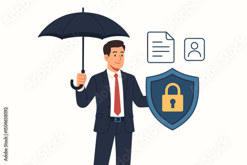 Vector illustration of data security and privacy. Businessman in suit uses umbrella and padlock shield to protect corporate documents and personal user information from threats.