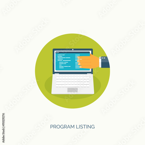 Vector illustration. Program listing. Flat computing background. Programming and coding. Web development and search. Search engine optimization. Innovation and technologies. Mobile app