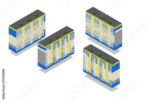 Vector isometric high rise building in urban city. Different sides of house on white background.