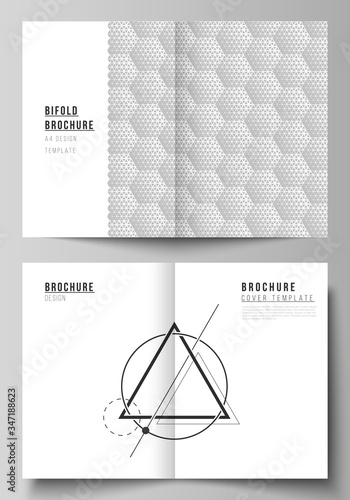 Vector layout of two A4 format modern cover mockups design templates for bifold brochure, magazine, flyer, booklet. Abstract geometric triangle design background using triangular style patterns.