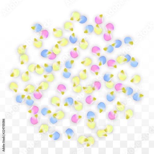 Vector Realistic Colorful Petals Falling on Transparent Background. Spring Romantic Flowers Illustration. Flying Petals. Sakura Spa Design. Blossom Confetti. Design Elements for Wedding Decoration.