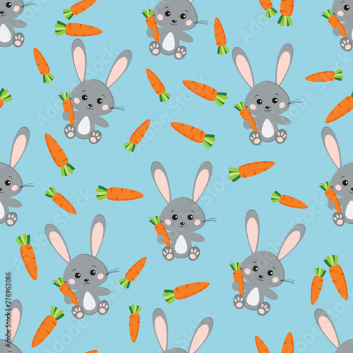 Vector seamless childrens pattern with cute rabbit and carrot on blue background.