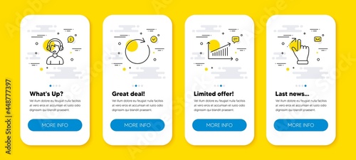 Vector set of Chart, Synchronize and Consultant line icons set. UI phone app screens with line icons. Touchscreen gesture icon. Presentation chart, Refresh or update, Call center. Swipe. Vector