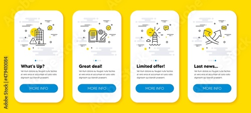 Vector set of Engineering documentation, Building warning and Lighthouse line icons set. UI phone app screens with line icons. Intersection arrows icon. Vector