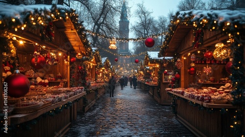 Vendors selling festive goods at a bustling Christmas market in a snowy square at dusk
