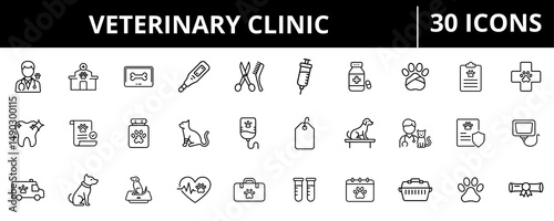 Veterinary icons for pets, services, clinic care, examination, and treatment.