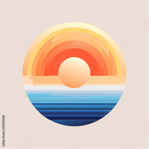 Vibrant Abstract Sunset Over Ocean with Horizontal Stripes and Circular Design