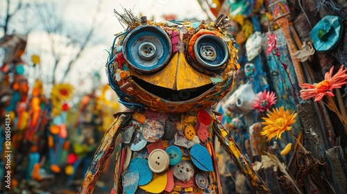 Vibrant and Whimsical Recycled Art Sculpture Featuring a Quirky Anthropomorphic Character Face Crafted from Repurposed and Found Objects Showcasing Eco Friendly and Imaginative Design