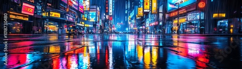 Vibrant cityscape with neon lights reflecting on wet pavement, showcasing the energy of urban nightlife.