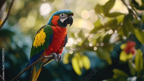 Vibrant Colorful Parrot Perched on Branch Among Lush Greenery