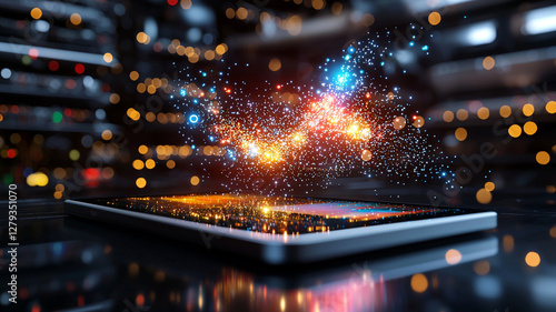 Vibrant Colorful Sparks Emanating from Tablet Screen Creating Dynamic Visual Effects on Dark Surface