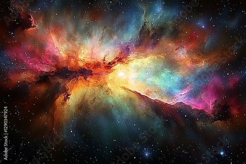 Vibrant cosmic nebula with swirling colors and stars, depicting the beauty of the universe