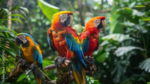 Vibrant Costa Rican exotic animals surrounded by jungle foliage.