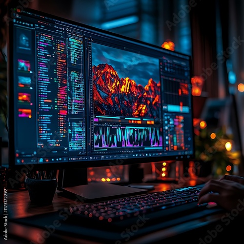 Vibrant Dashboard Displaying Data Analysis and Graphic Visualizations in a Creative Workspace with Warm Lighting and Modern Technology Setup