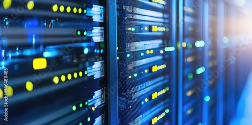 Vibrant data server array with yellow and green indicators in sharp lighting, ideal for cloud computing, analytics, or digital networking presentations.