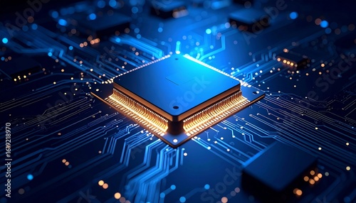 Vibrant Digital Core: Glowing CPU on a Blue Circuit Board with Luminous Pathways