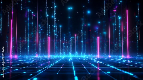 Vibrant digital landscape, neon lights and grids, abstract futuristic design.