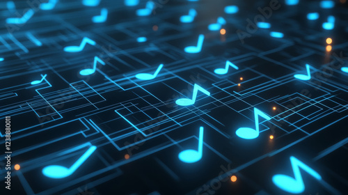 vibrant digital pattern featuring glowing blue musical notes intertwined with abstract lines, creating dynamic and rhythmic visual experience