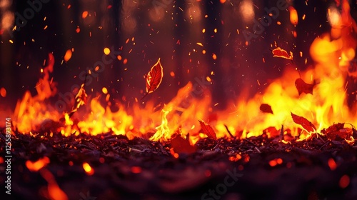 Vibrant Flames with Falling Leaves in a Dark Forest Setting