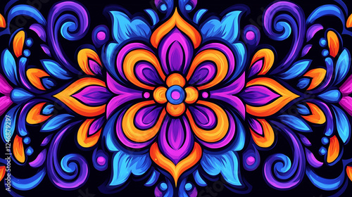 Vibrant floral pattern, symmetrical design, bright colors, dark background.