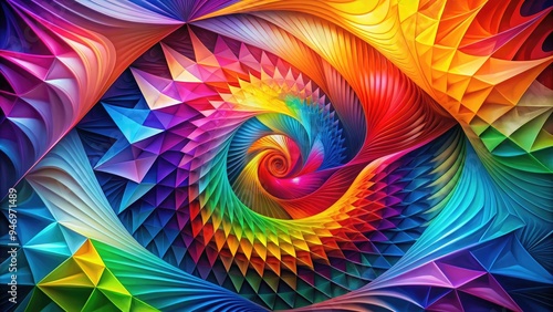 Vibrant gradient hues illuminate intricate abstract composition of intersecting geometric shapes, swirling patterns, and fragmented forms, evoking a sense of dynamic energy and visual tension.