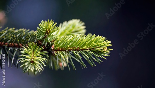Vibrant green pine branch with fresh growth against dark backdrop evokes nature's beauty and resilience, perfect for holiday themes or botanical studies