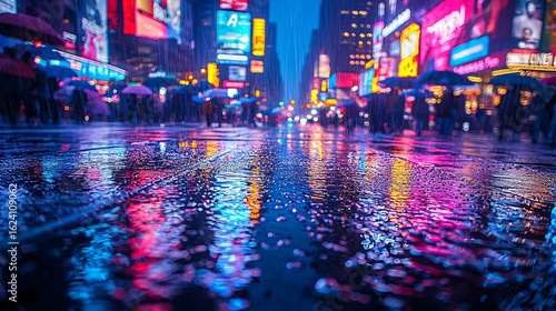 Vibrant Night Scene of Times Square with Reflections in Rain