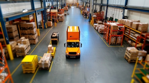 Vibrant Orange Delivery Truck Navigating Warehouse Aisle Filled with Stocked Shelves on a Busy Day