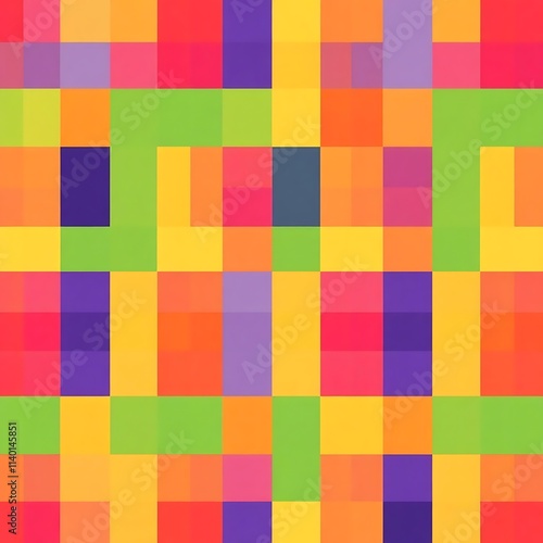 Vibrant Pixelated Mosaic: A lively and colorful abstract background of pixelated squares in various shades of red, orange, yellow, green, and purple. Perfect for adding a playful.