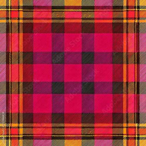 Vibrant plaid pattern in red. orange. pink. and black.