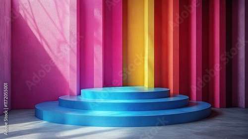 Vibrant Rainbow Backdrop with Circular Blue Platform