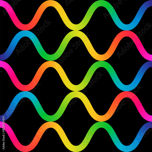 Vibrant rainbow waves on black create a dynamic modern background ideal for vibrant creative projects