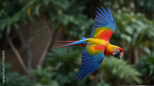 Vibrant Red Macaw Parrot in Greenery - This striking image captures a majestic red macaw parrot amidst lush green foliage, showcasing its vibrant plumage.generative.ai