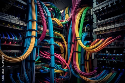 Vibrant Server colorful cables. Tech rack. Generate ai
