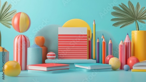 Vibrant still life with colorful geometric shapes, stationery, and tropical elements set against a serene blue backdrop