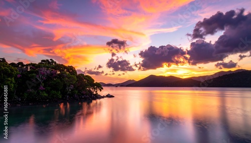 Vibrant sunset over a tranquil bay