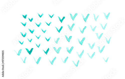 Vibrant turquoise brush stroke pattern with abstract checkmark elements on white background.