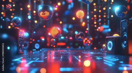 Vibrant Urban Dance Floor with Floating Disco Lights and Speakers