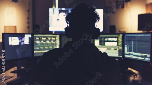 Video Editor at Work: Post-Production Studio with Multiple Monitors and Professional Equipment