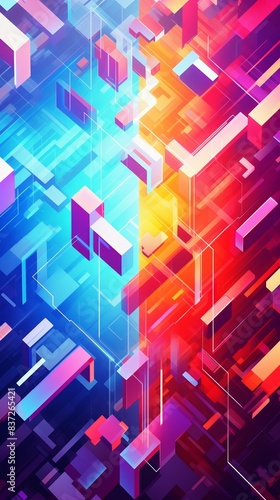 Video game background, abstract geometric shapes, vibrant colors, dynamic motion