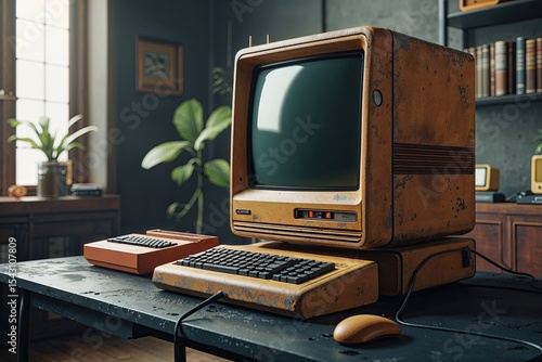 Vintage 3D Render of Retro Computing System on Dark Tabletop Surface