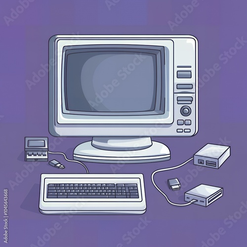 Vintage computer illustration with monitor, keyboard, and peripherals.