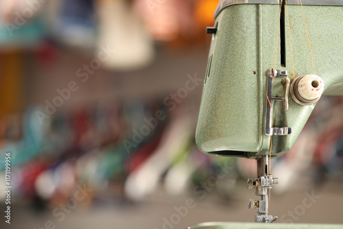Vintage sewing machine with thread on blurred background, macro view. Space for text