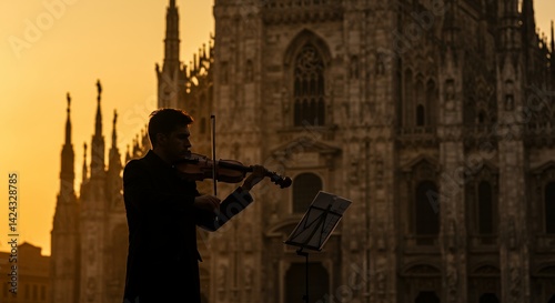Violinist Playing Violin Sunset Cathedral