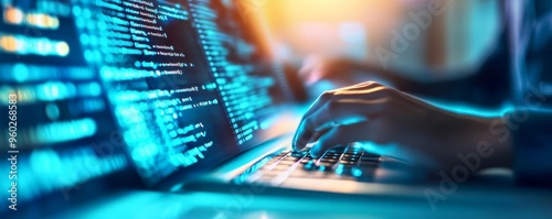 Virtual database session, holographic interface, programmer coding, blue tones