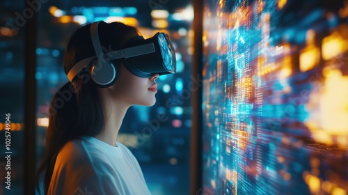 Virtual reality experience with woman wearing VR headset, digital interface background