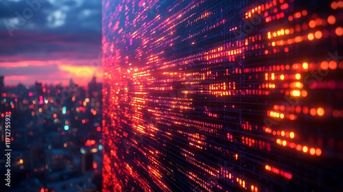 Virtual screen displaying AI machine learning algorithm big data analytics computer code set against techinspired background.