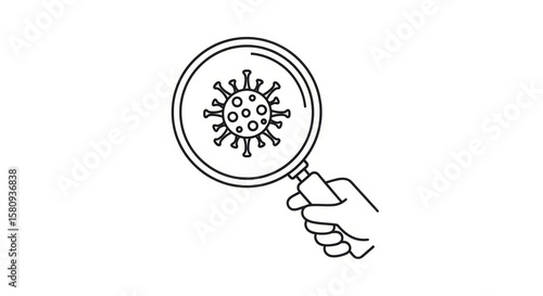 Virus Research Under Magnification - A simple line drawing of a hand holding a magnifying glass, focusing on a virus. Symbolizing research, investigation, science, health, and discovery