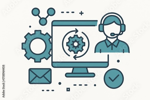 Visual communication of technical support with gears and computer depicting problem-solving strategies in digital environments demonstrating efficiency and workflow optimization principles