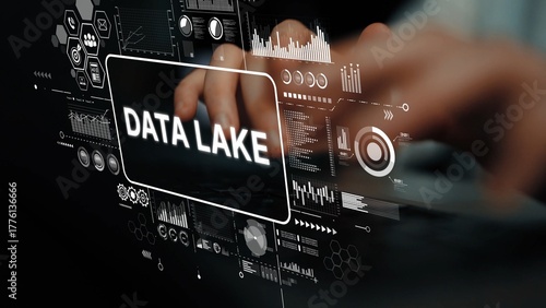 Visual Representation of Data Lake Concept with User Hands Engaging with Digital Interface and Graphs. Asymptotic smart data analytic.
